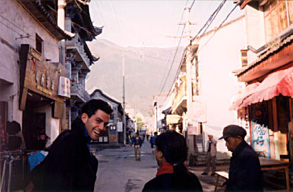 The main drag in Dali. Early morning on Tuesday, April 5, 1994. Dan and Cathy are in the foreground; the cliff-faced mountains form the backdrop.