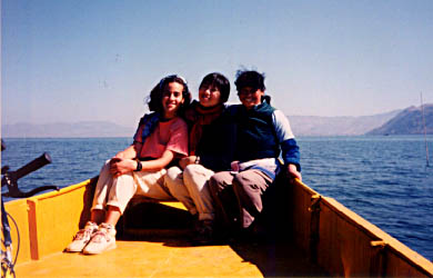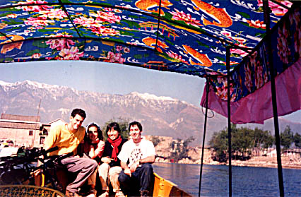 Looking toward our destination, the eastern shore of the lake. L to R: Larissa, Cathy, our boat captain (a young Bai woman)